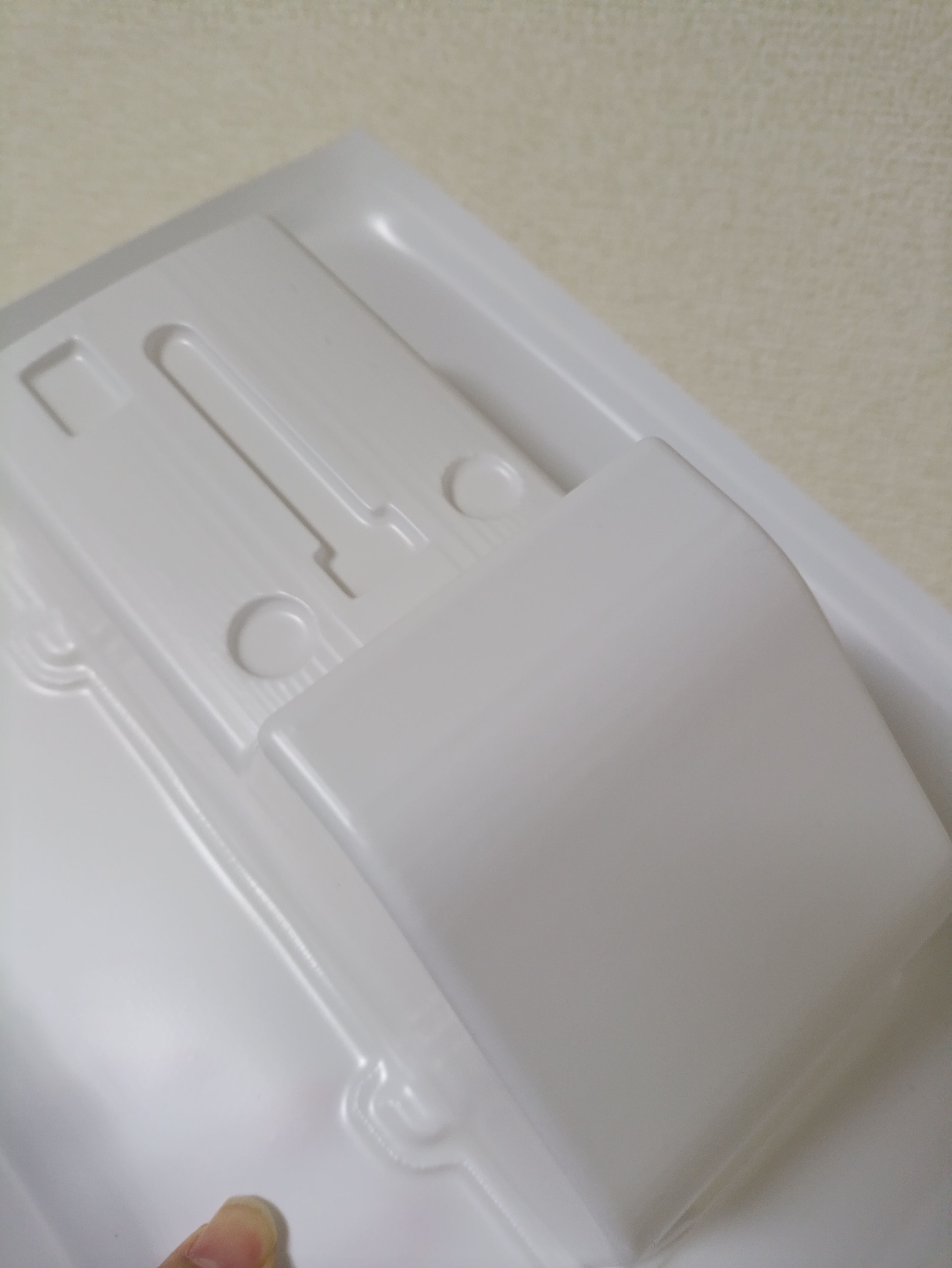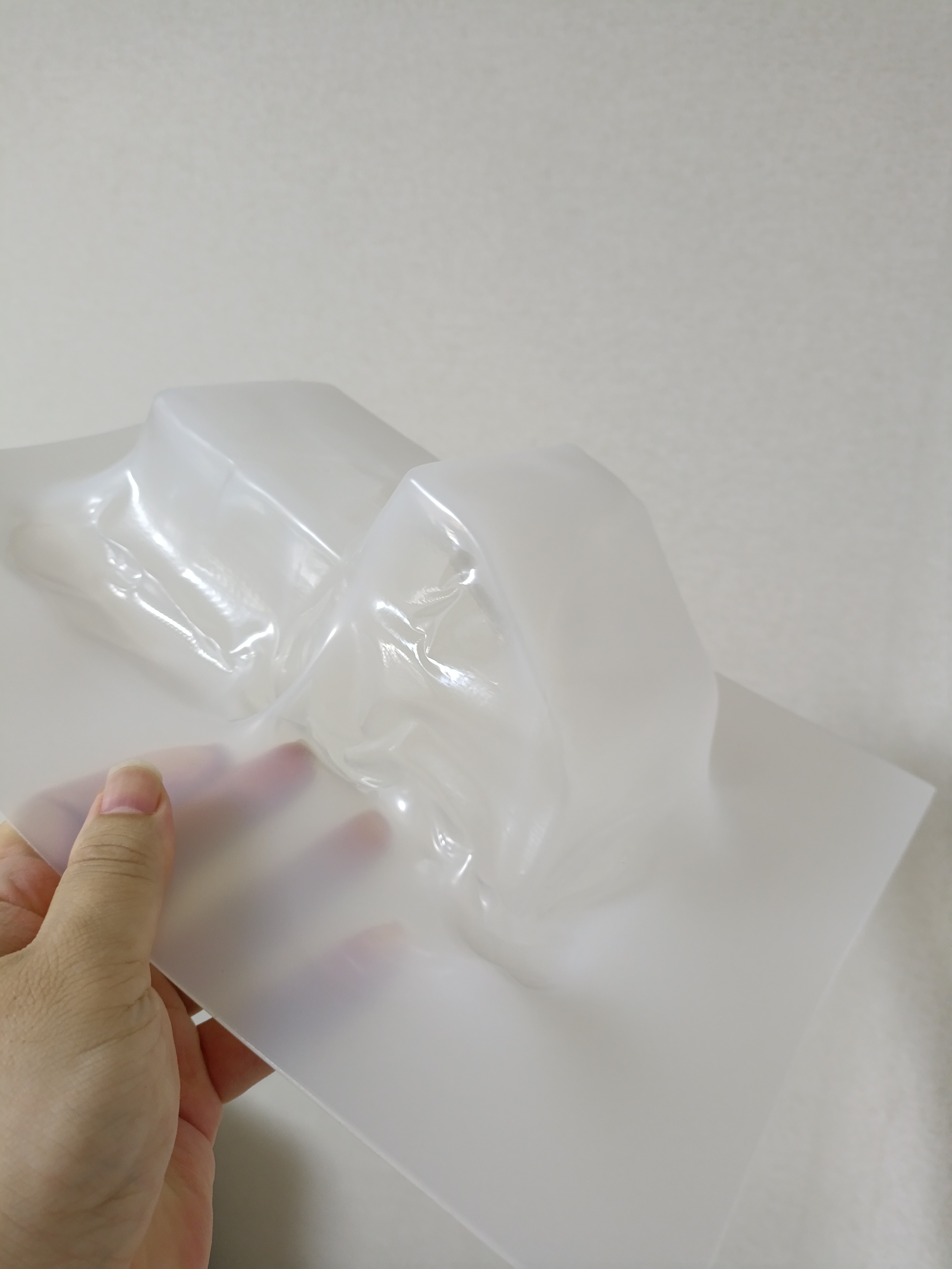 もう少し温度を上げればうまくいくか?と思って試したCase4。Case3よりは伸びてくれたものの、固まるのが早いのか型に吸着せず失敗。厚みも均一にならず乳白色も半端に消えて透明になりで、多少温度設定を工夫しても駄目そうです。残念。