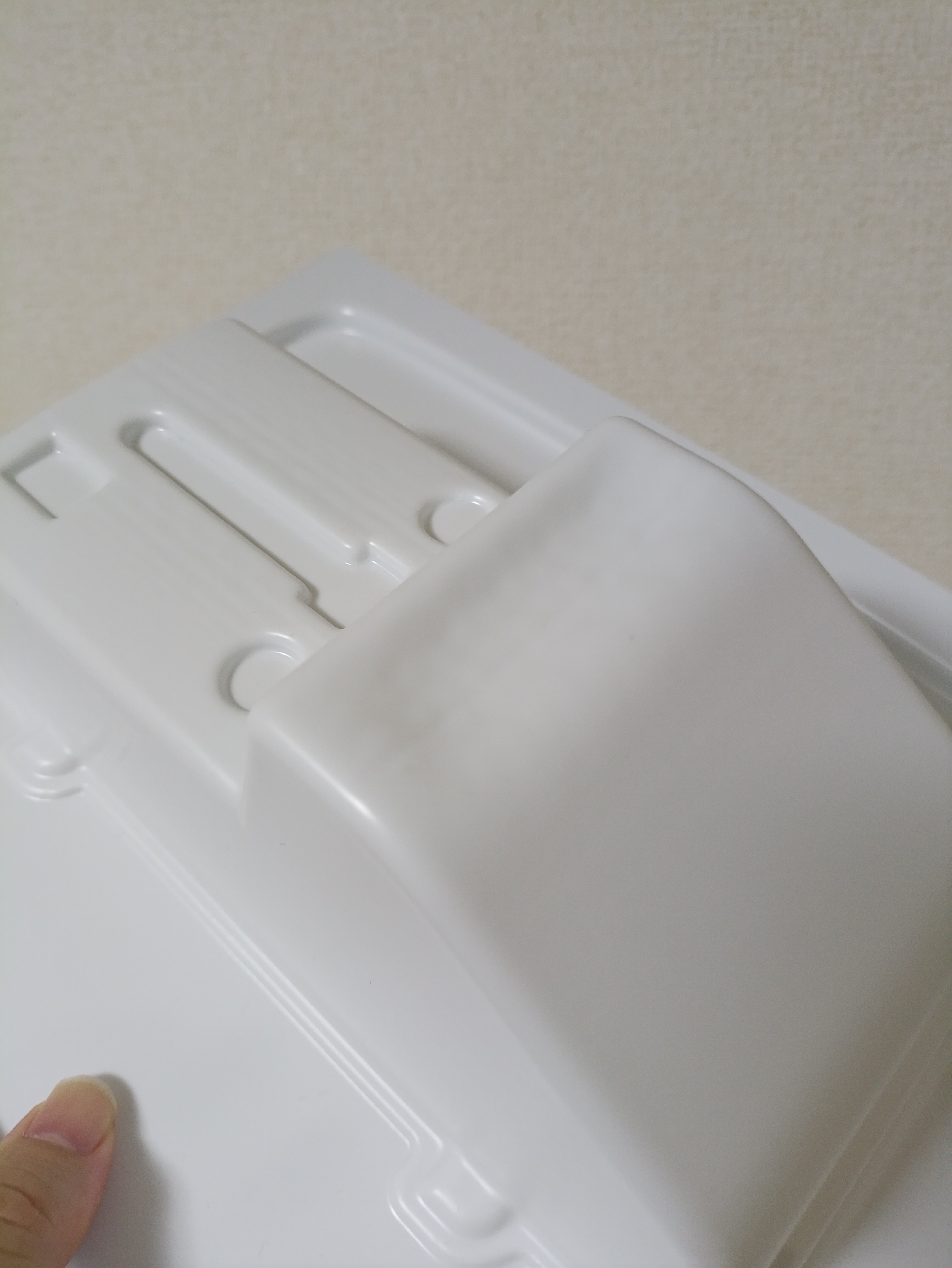 もう少し温度を上げればうまくいくか?と思って試したCase4。Case3よりは伸びてくれたものの、固まるのが早いのか型に吸着せず失敗。厚みも均一にならず乳白色も半端に消えて透明になりで、多少温度設定を工夫しても駄目そうです。残念。
