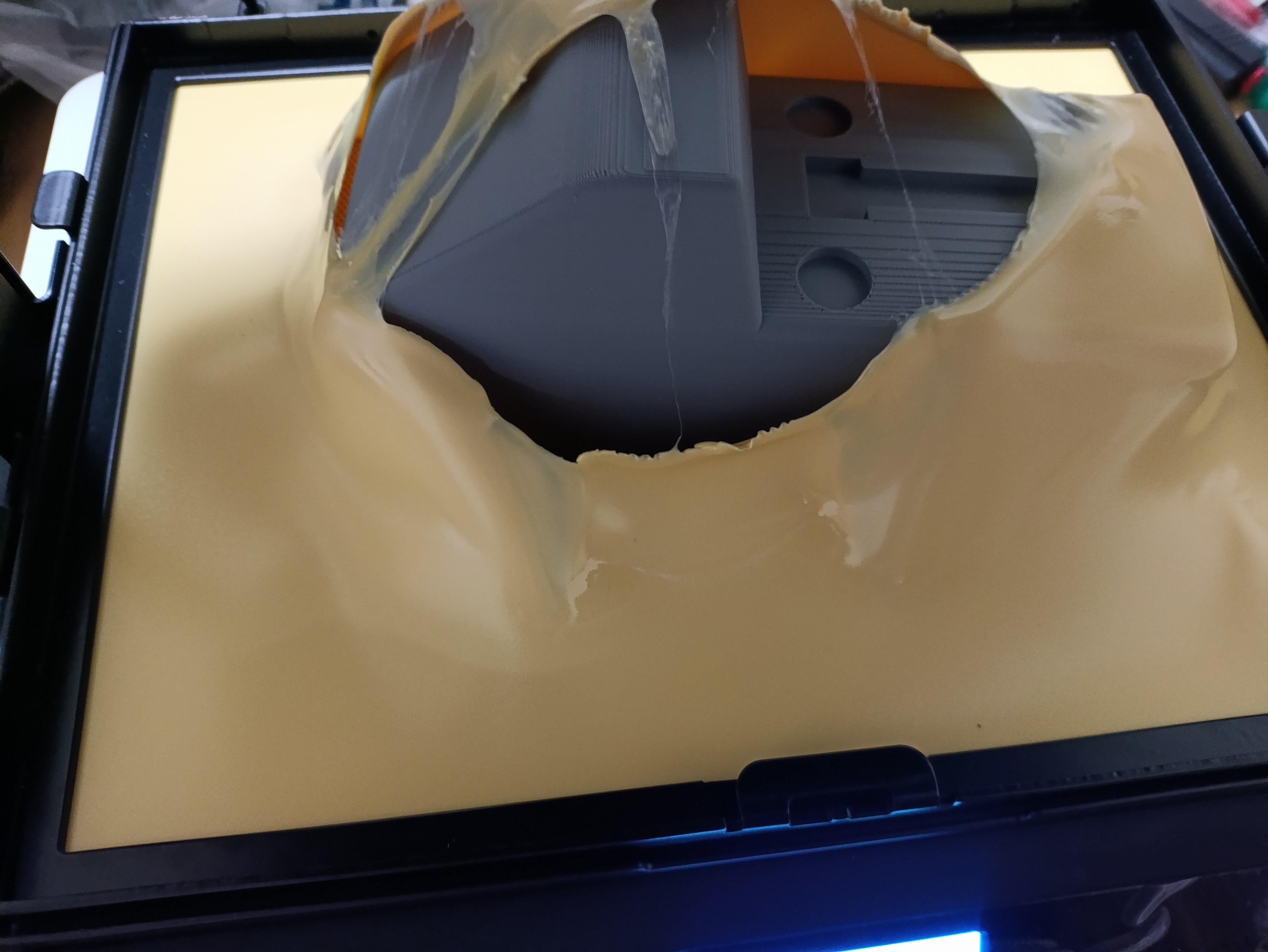 そこで、まあうまくいかないだろうなと思いつつもCase5。薄い素材を複数枚セットする荒わざ。しかしこれも綺麗にはいかず。シート間に空気が入ってしまう。それに加えて、おそらくヒーターに一番近いシートの温度が上がりすぎているのでしょう。煙が上がっており、耐熱PLAの型も思いっきり溶けて変形してしまいました。